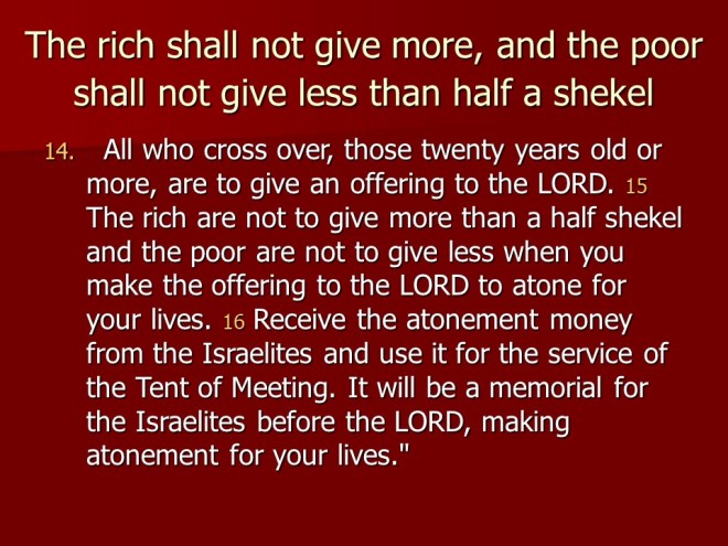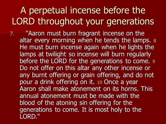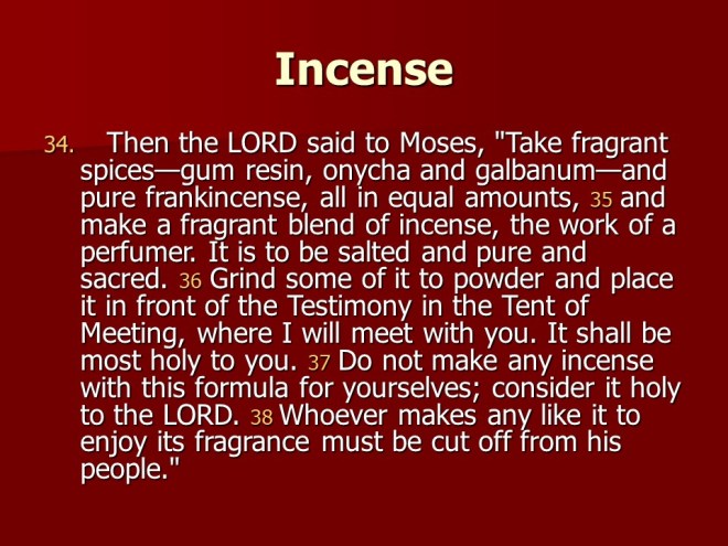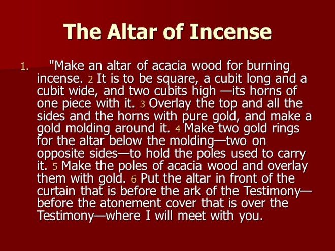 Exodus 30 describes the altar of incense, mentions rules for the poll tax and the basin for washing, anointing oil and rules for sacred incense.