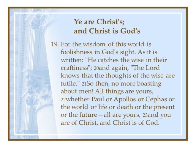 1 Corinthians 3.The Apostle Paul warned the Corinthians that sectarianism is carnal, we are all servants of the Lord Jesus Christ. One is planting, one is watering, but God gives the increase. Paul gave them another warning: Avoid worldly wisdom, “For the wisdom of this world is foolishness with God.