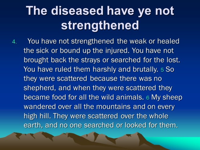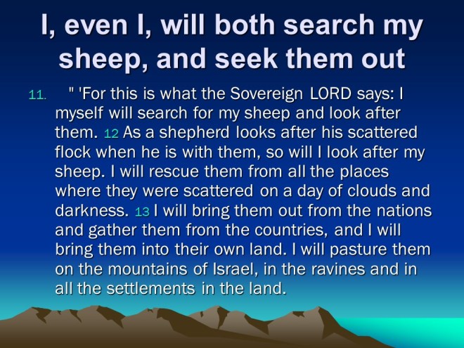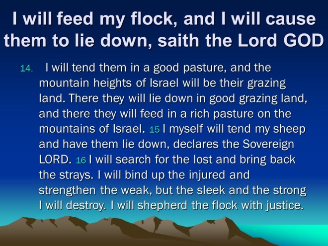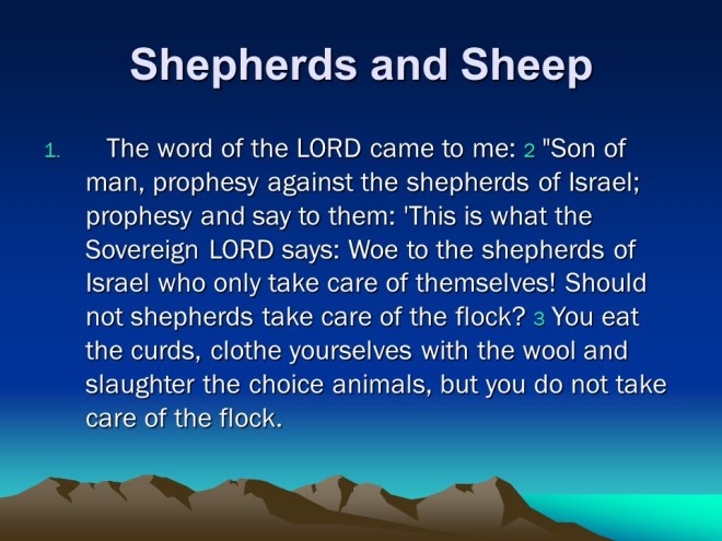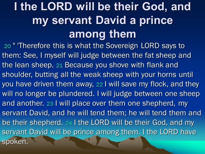 Ezekiel 34. The shepherds of Israel are not true shepherds. God is the true shepherd. “And I will set up one shepherd over them, and he shall feed them, even my servant David; he shall feed them, and he shall be their shepherd. And I the Lord will be their God, and my servant David a prince among them; I the Lord have spoken it. And I will make with them a covenant of peace, and will cause the evil beasts to cease out of the land: and they shall dwell safely in the wilderness, and sleep in the woods. And I will make them and the places round about my hill a blessing; and I will cause the shower to come down in his season; there shall be showers of blessing.“