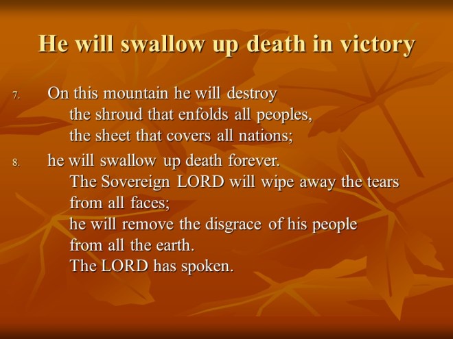 Isaiah 25. After the dire prophecies of Chapter 24 the prophet Isaiah recorded this song of praise. Read verse 8 carefully and let it sink in!