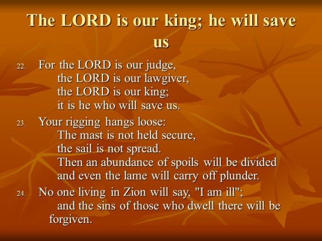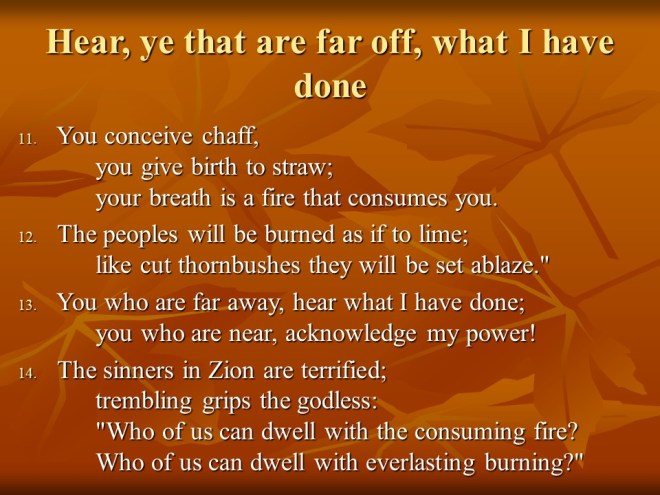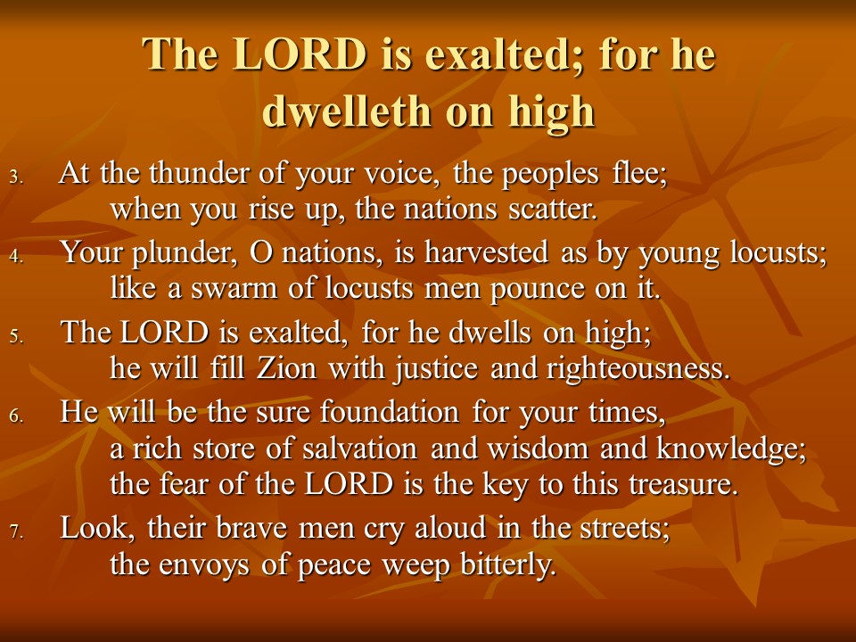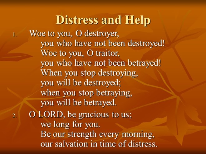 Isaiah 33. It begins with a prayer in distress, for there is a coming judgment of Zion, the LORD will be lifted up, and He will deliver his people.