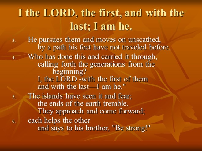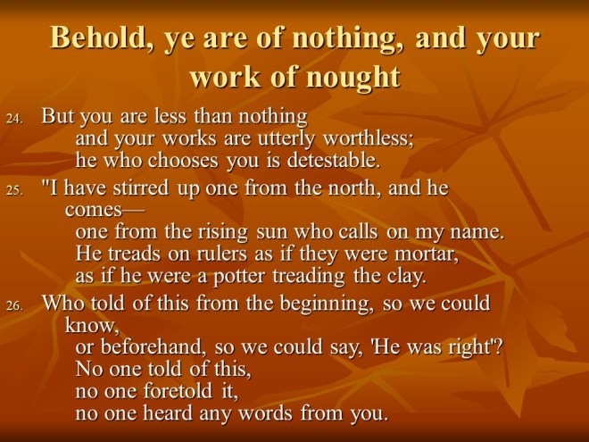 Isaiah 41 waxes eloquent about the helper of Israel. “How firm a foundation” it is to stand with God. Compare that to the futility of idols!