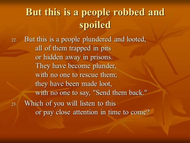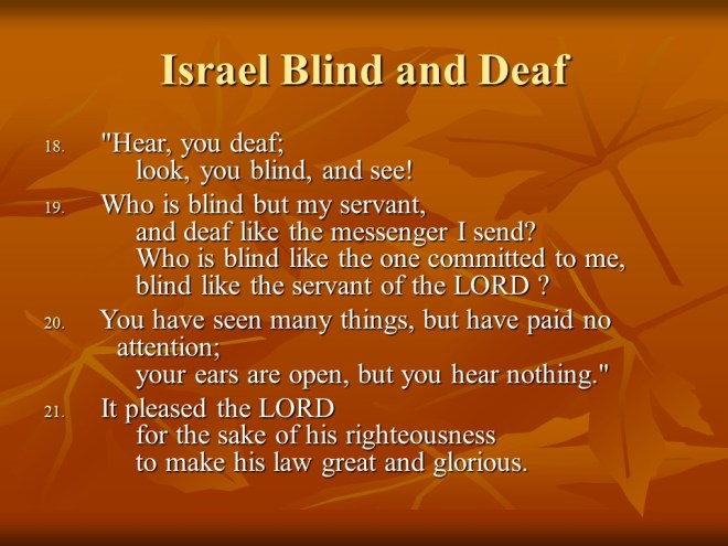 Isaiah 42, the servant of the LORD, the New Song, The LORD’s promises and Israel’s disobedience.