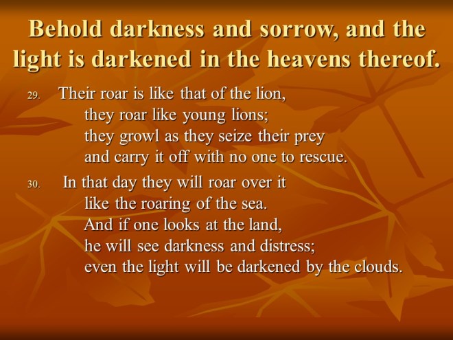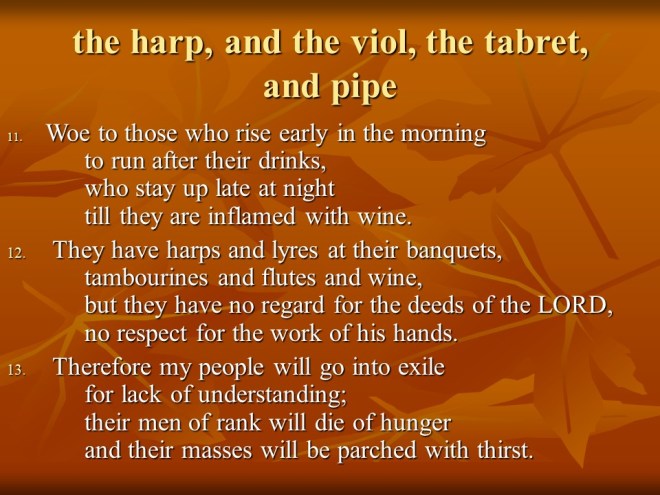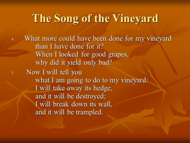 Isaiah 5. The Song of the Vineyard. The chapter starts out beautifully, but then tells of judgement. In chapter three was proclaimed two woes. In chapter five God proclaimed six more woes.