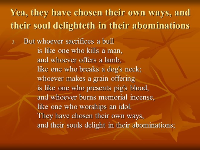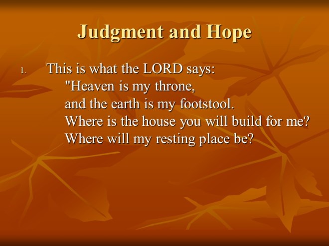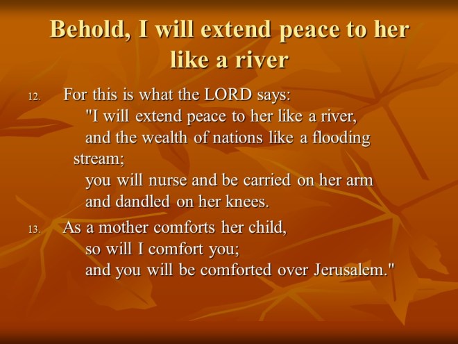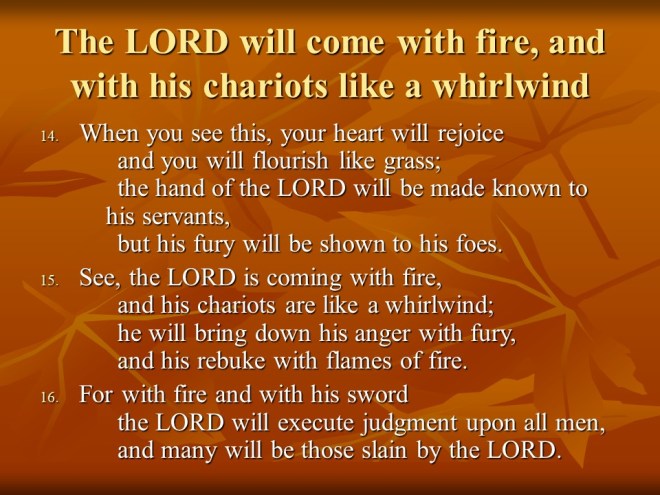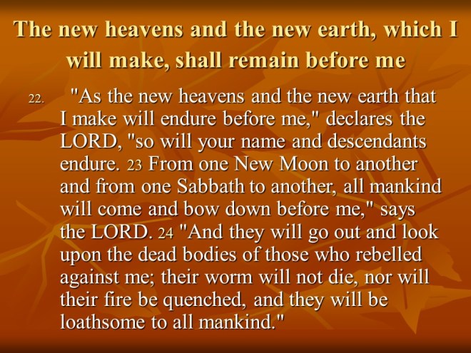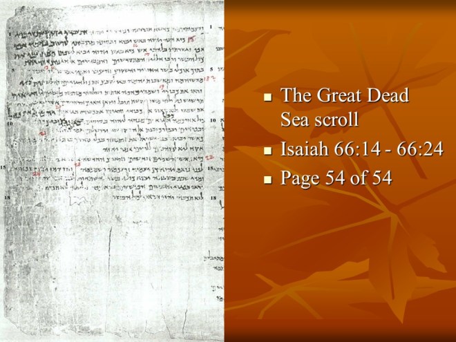 Isaiah 66 speaks of judgement and hope, and true and false worship. Yet, the LORD will vindicate Zion; “Behold, I will extend peace to her like a river, and the glory of the Gentiles like a flowing stream“. Finally, God via Isaiah wraps up the scroll with a description of the Day of the LORD and its sobering aftermath.