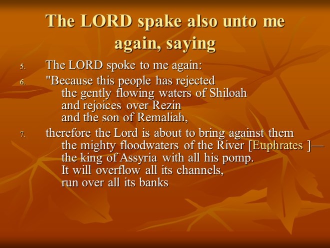 Isaiah 8. Prophetically Assyria will invade Israel, an instrument of God to execute judgement on the unfaithful. The remedy is to fear God and Him alone.