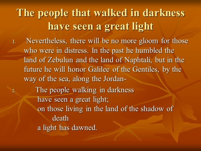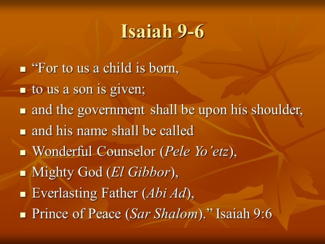 Isaiah 9. A must read chapter of Isaiah. It speaks of “The people that walked in darkness have seen a great light: they that dwell in the land of the shadow of death, upon them hath the light shined.” Then it states: “For unto us a child is born, unto us a son is given: and the government shall be upon his shoulder: and his name shall be called Wonderful, Counsellor, The mighty God, The everlasting Father, The Prince of Peace.” It speaks of Christ, the coming Messiah, both his humanity (a child) and his deity (son of God).