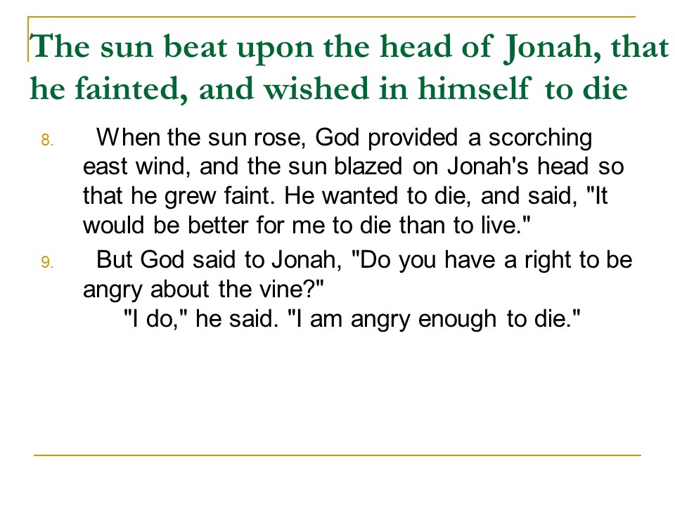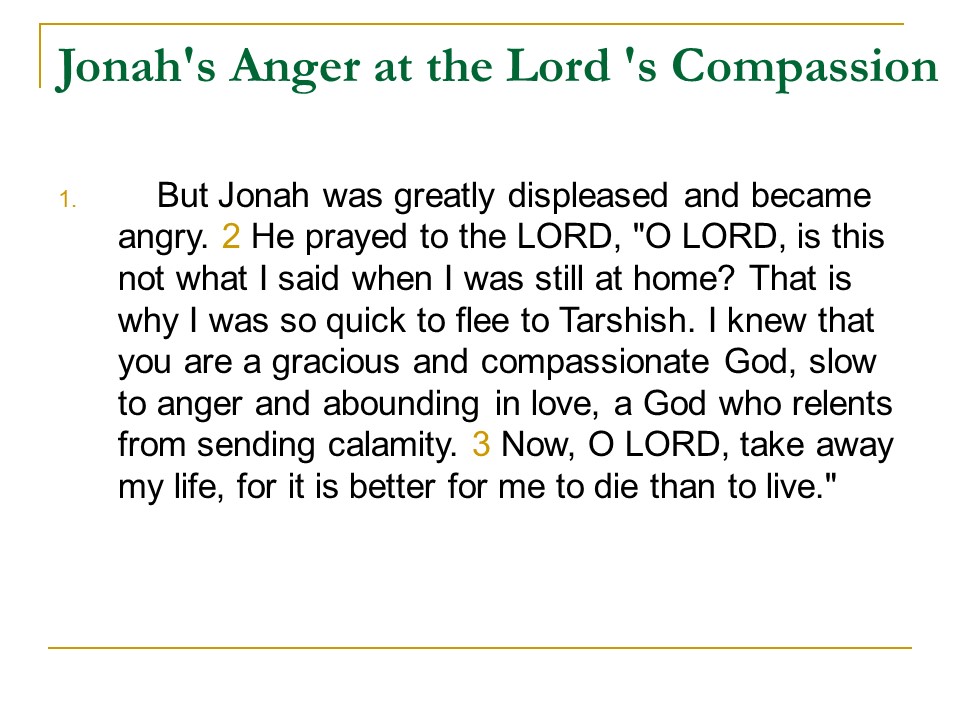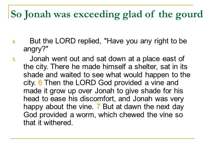 Even though Jonah obeyed God and did His will, he was still full of hate towards the Ninevehites, remembering all the evil they had done to the Israelites during the ages.
