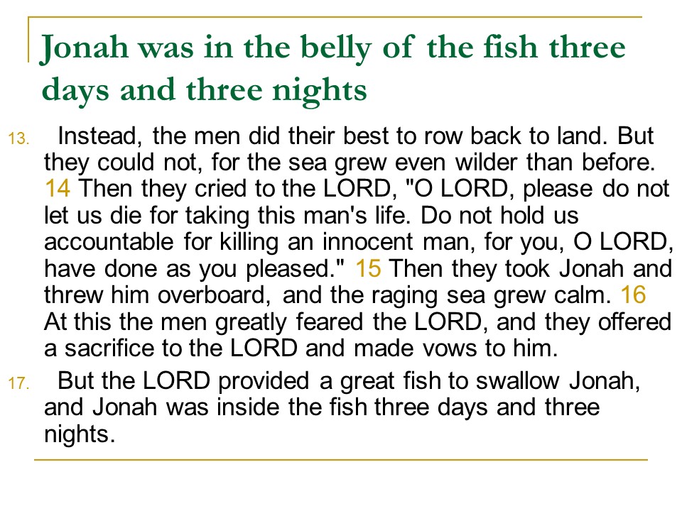 This is the sign of Jonah. He was in the belly of the fish three days and three nights.