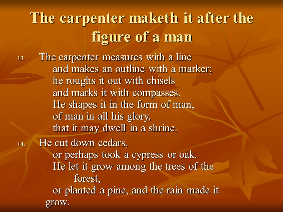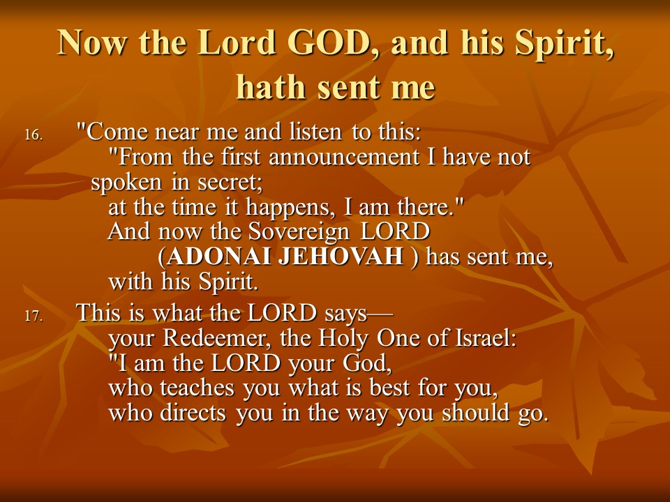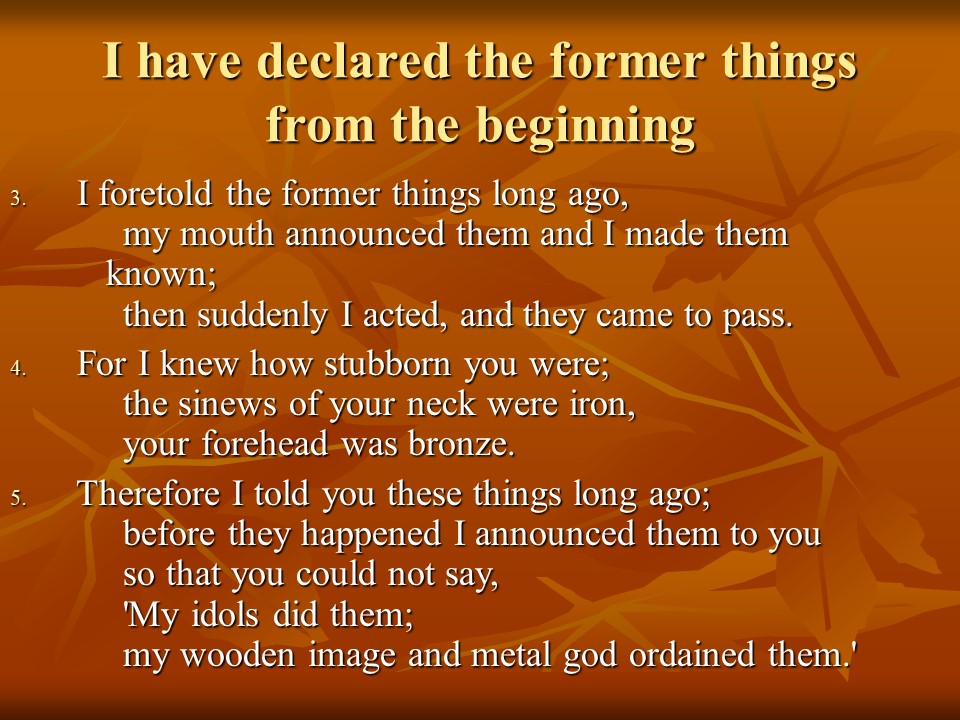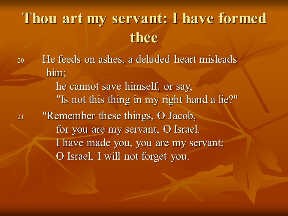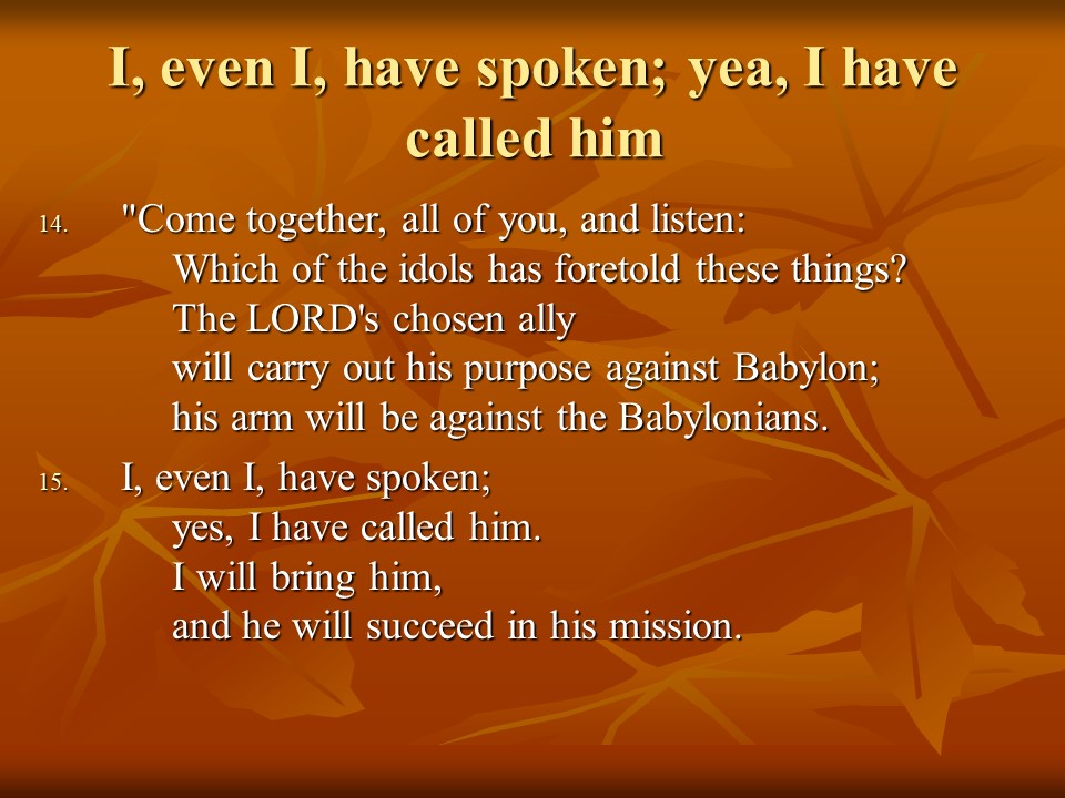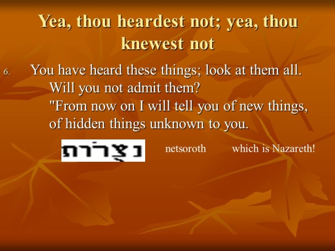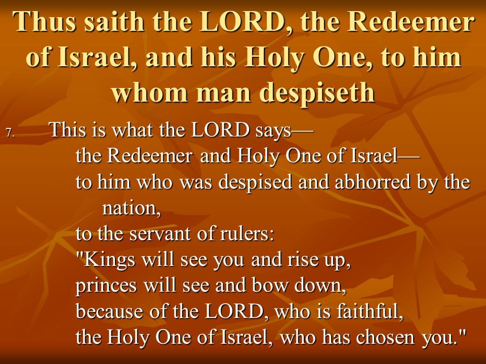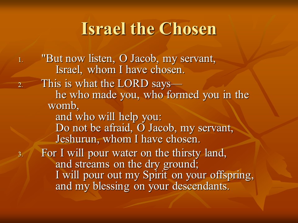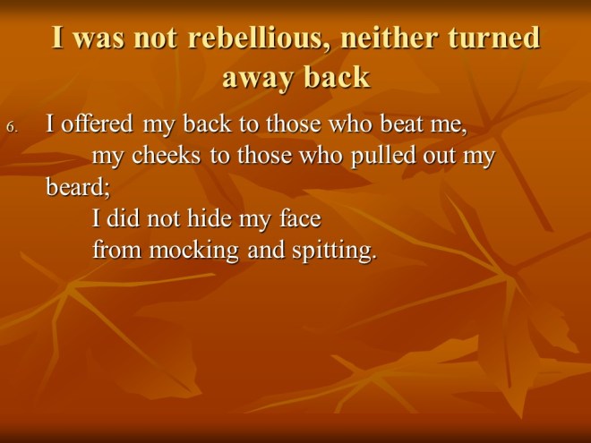 Chapter 53, the Suffering servant really begins in chapter 12, verse 13. The passage on suffering Servant is never read in Jewish Synagogues, not in the triennial reading, nor at Holy days. Up to now the LORD, through the prophet Isaiah has referred to his servant Israel, and in one case, in Isaiah 45:1 Cyrus: Thus saith the Lord to his anointed, to Cyrus, and 45:4 For Jacob my servant’s sake, and Israel mine elect, I have even called thee by thy name: I have surnamed thee, though thou hast not known me.