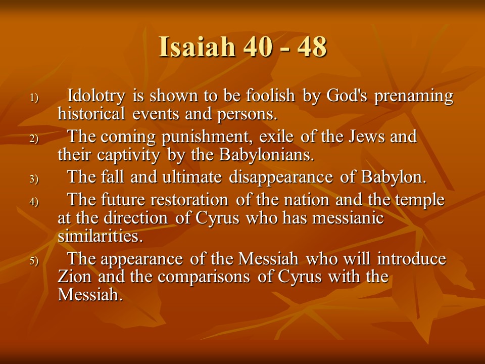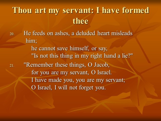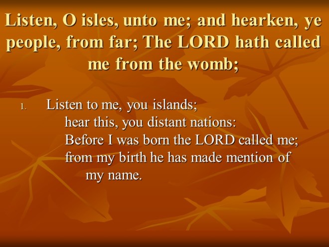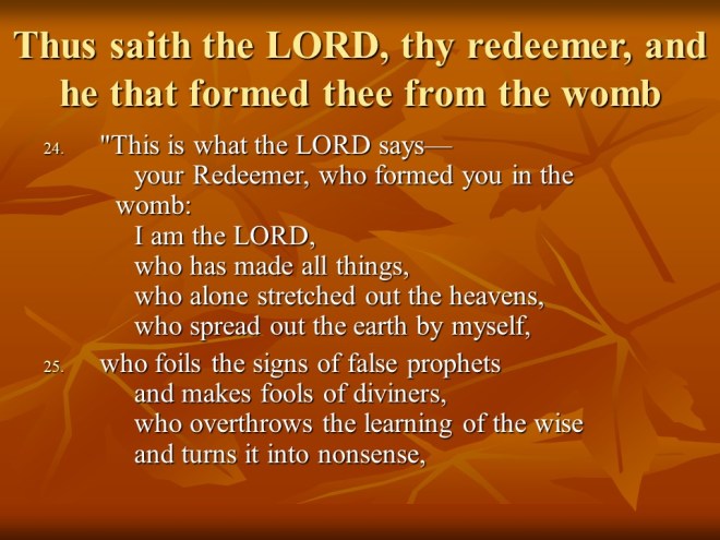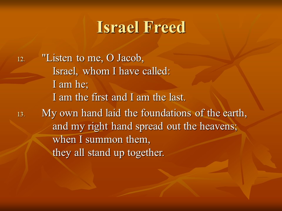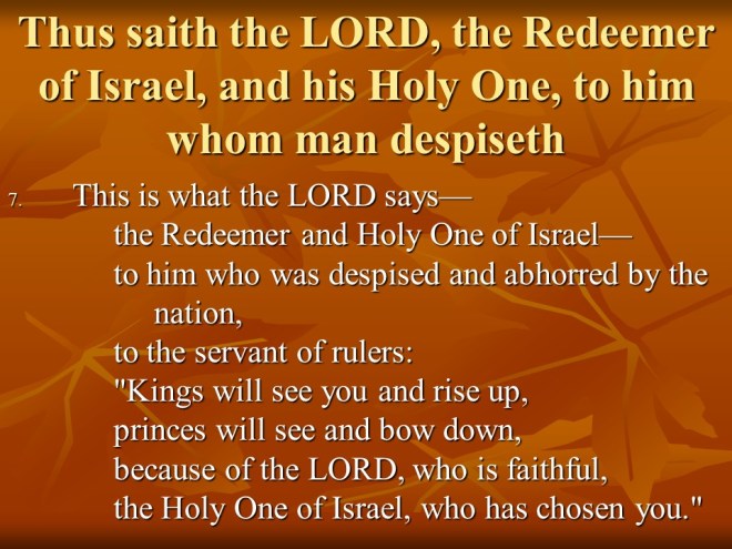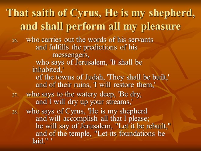 The other big prophesy is found in Chapter 53, the Suffering servant. It begins in chapter 12, verse 13. The passage on the suffering Servant is never read in Jewish Synagogues, not in the triennial reading, nor at Holy days. Up to now the LORD, through the prophet Isaiah has referred to his servant Israel, and in one case, in Isaiah 45:1 Cyrus: Thus saith the Lord to his anointed, to Cyrus, and 45:4 For Jacob my servant’s sake, and Israel mine elect, I have even called thee by thy name: I have surnamed thee, though thou hast not known me.