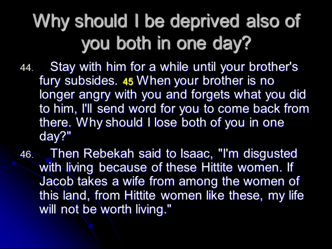 Rebekah: Let the curse fall on me. She didn’t have it easy after that.