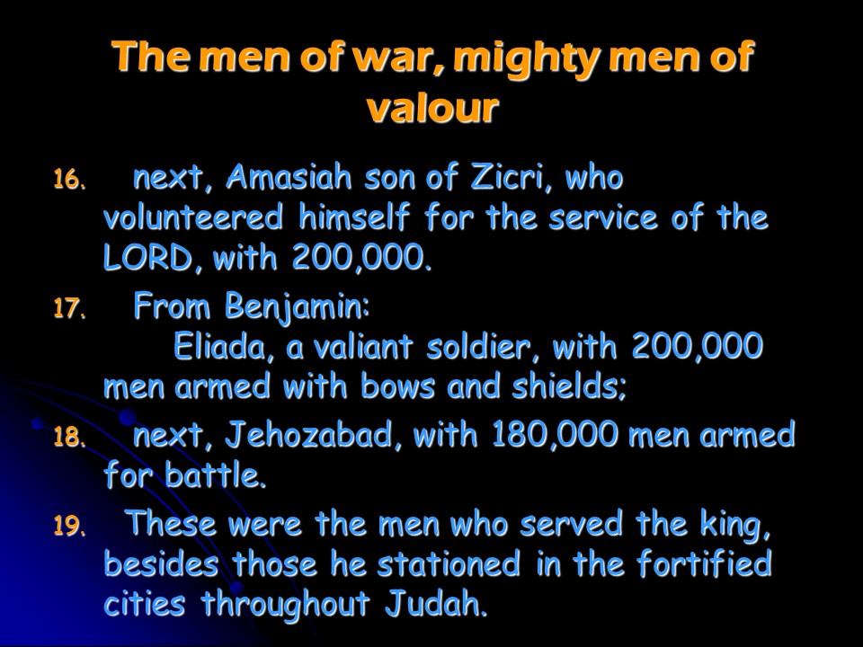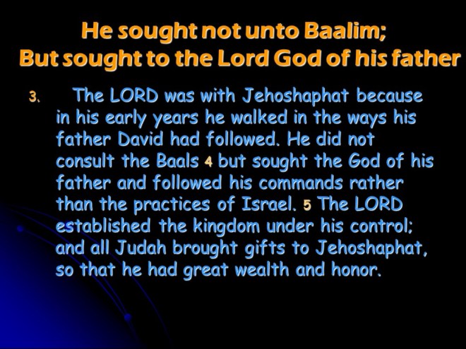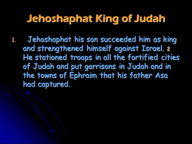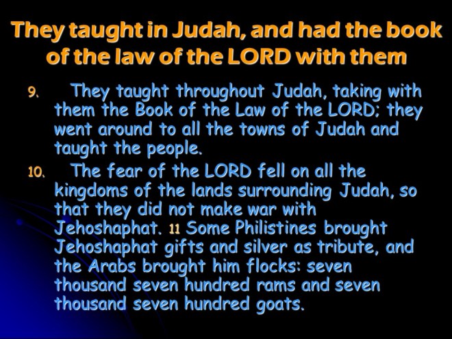 2 Chronicles 17. Jehoshaphat reigned in Judah, they took the Book of the Law around the country and taught the people. The fear of the LORD fell on the surrounding countries, so Judah had peace for years.