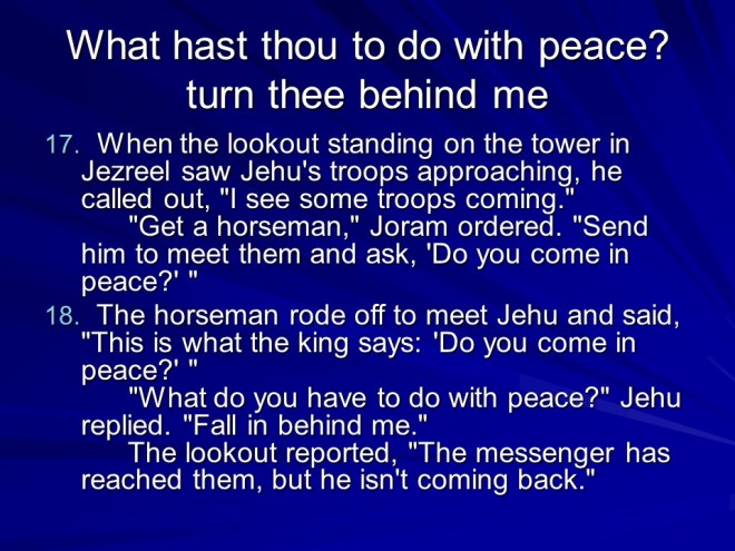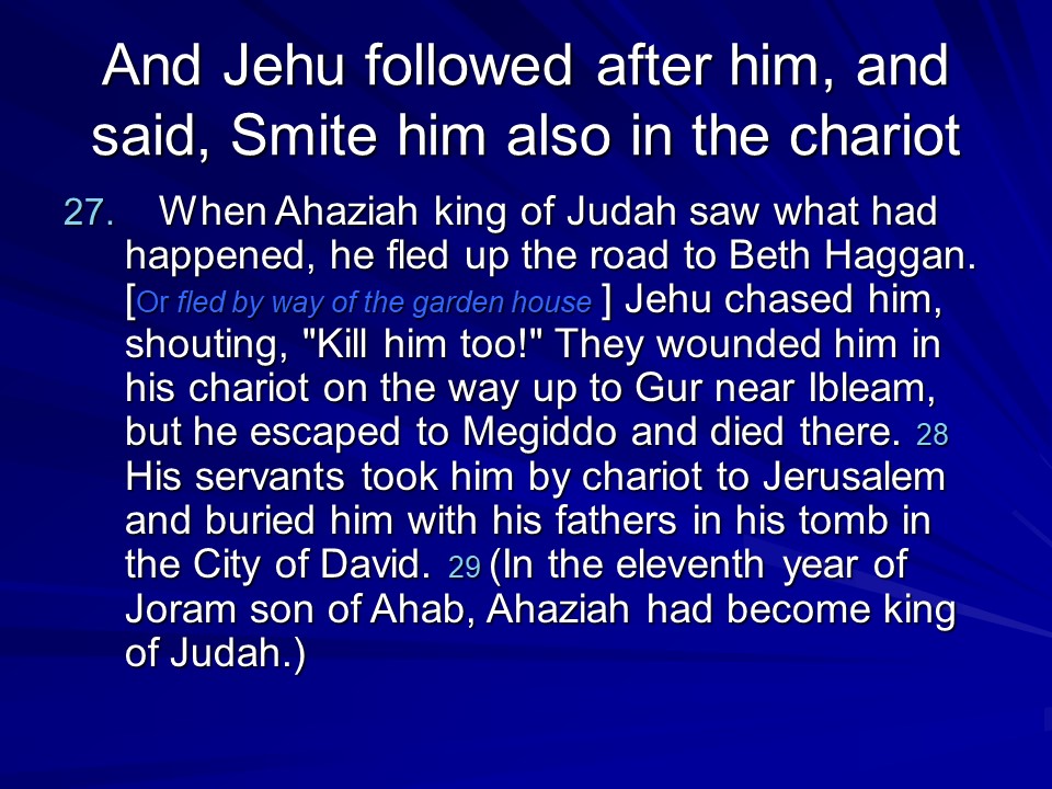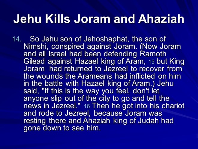2 Kings 9. Jehu, a man of action was anointed king of Israel, Joram of Israel was killed, Ahaziah of Judah likewise, and finally Jezebel suffered the most humiliating and violent death possible, thrown out from a window, trampled to death by horses and was then eaten by dogs.