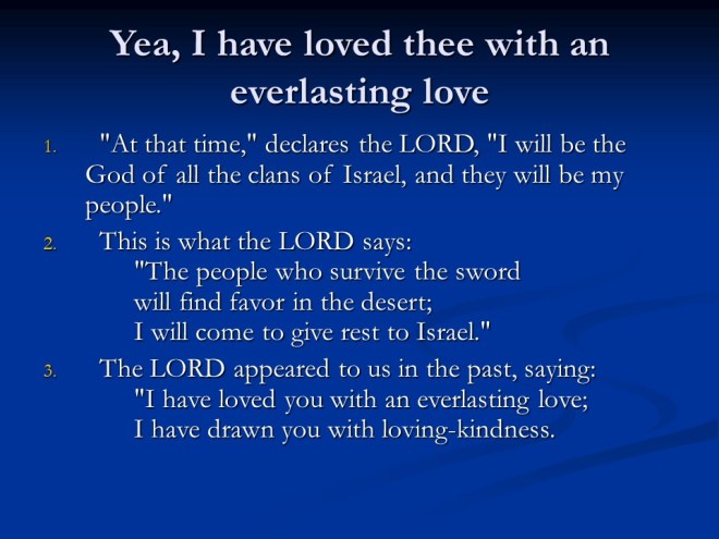 Jeremiah 31 is a most remarkable chapter. Jeremiah, in a dream heard God say “Yea, I have loved thee with an everlasting love” and God continued by promising that the remnant of Israel will be saved. Then, in verse 15 God provided an abrupt change “A voice was heard in Ramah, lamentation, and bitter weeping; Rachel weeping for her children refused to be comforted for her children, because they were not.” Returning to the dream God gave an even more remarkable statement “O thou backsliding daughter? for the Lord hath created a new thing in the earth, A woman shall compass a man.” After this Jeremiah woke up from his pleasant dream. God continued speaking, promising mercy on Ephraim, future prosperity to Israel, and promised the New Covenant: “But this shall be the covenant that I will make with the house of Israel; After those days, saith the Lord, I will put my law in their inward parts, and write it in their hearts; and will be their God, and they shall be my people. And they shall teach no more every man his neighbour, and every man his brother, saying, Know the Lord: for they shall all know me, from the least of them unto the greatest of them, saith the Lord: for I will forgive their iniquity, and I will remember their sin no more.