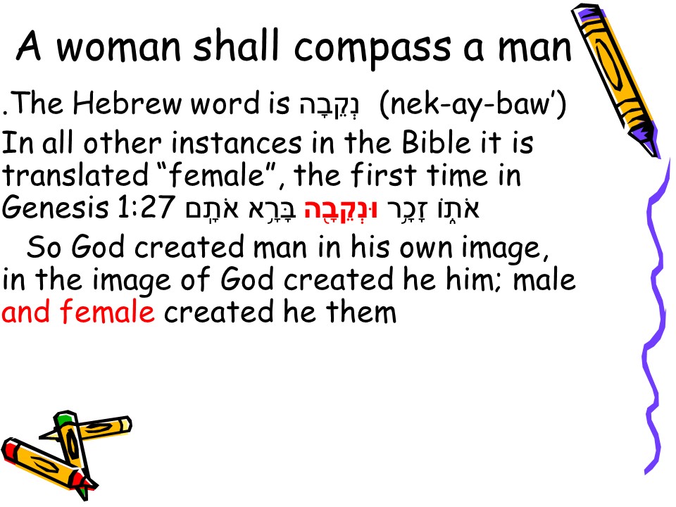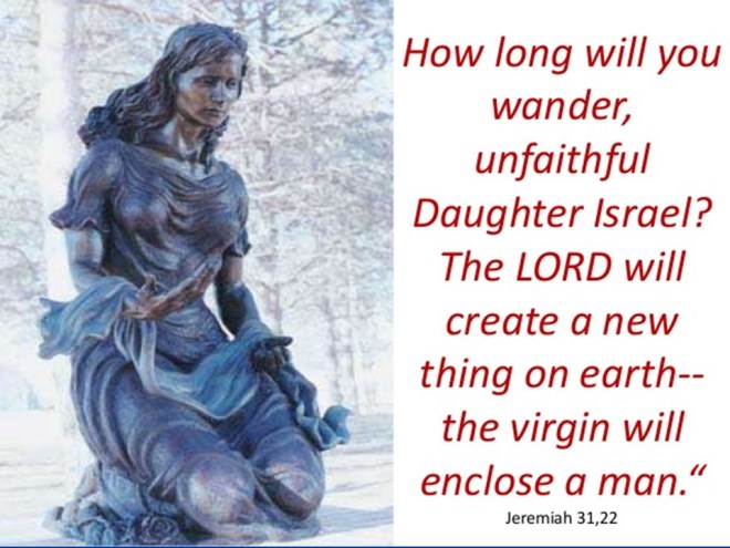 Jeremiah 31 is a most remarkable chapter. Jeremiah in a dream heard God say “Yea, I have loved thee with an everlasting love” and continued by promising that the remnant of Israel will be saved. Then, in verse 15 God provided an abrupt change “A voice was heard in Ramah, lamentation, and bitter weeping; Rachel weeping for her children refused to be comforted for her children, because they were not.” Then,returning to the dream came an even more remarkable statement “O thou backsliding daughter? for the Lord hath created a new thing in the earth, A woman shall compass a man.” After this Jeremiah woke up from his pleasant dream. God continued speaking, promising mercy on Ephraim, future prosperity to Israel, and promised the New Covenant: “But this shall be the covenant that I will make with the house of Israel; After those days, saith the Lord, I will put my law in their inward parts, and write it in their hearts; and will be their God, and they shall be my people. And they shall teach no more every man his neighbour, and every man his brother, saying, Know the Lord: for they shall all know me, from the least of them unto the greatest of them, saith the Lord: for I will forgive their iniquity, and I will remember their sin no more.