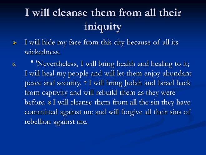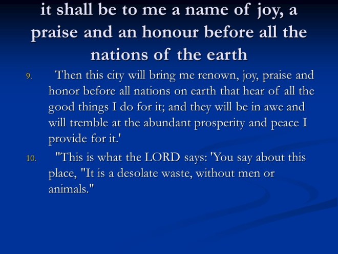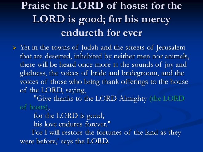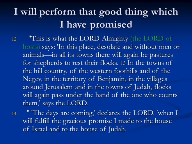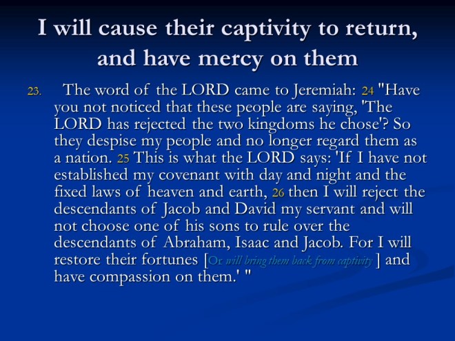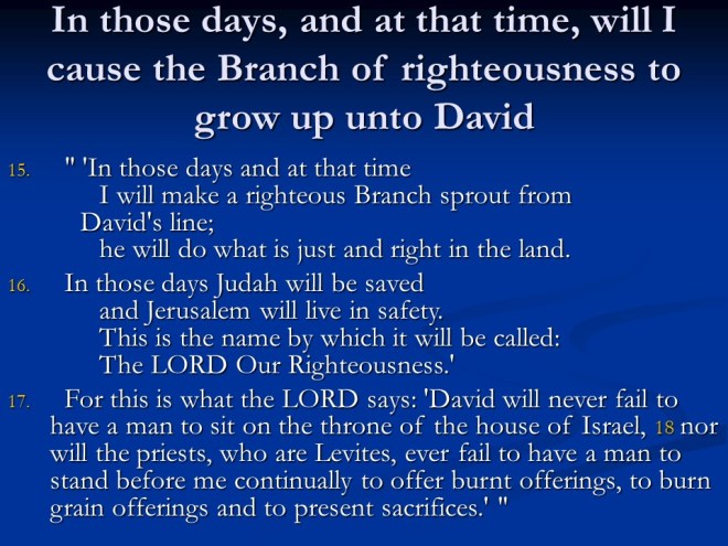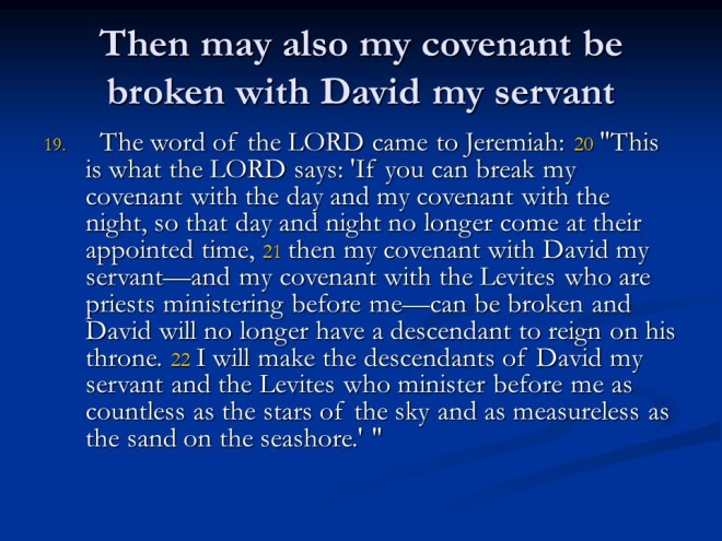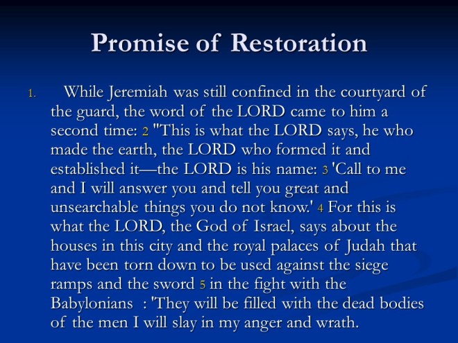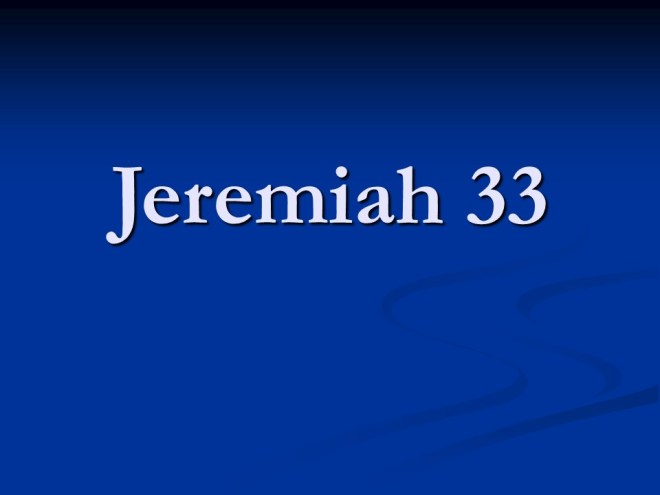 Jeremiah 33. The restoration of Israel is foretold, and the permanence of God’s Covenant with the house of David is restated.
