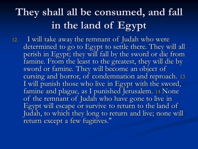 Jeremiah 44. Some Israelis escaped to Egypt. Nothing good would come out of that. Read the horrible future that awaited them.