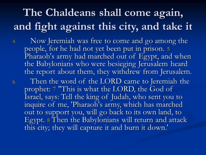 Jeremiah 37. Zedekiah held on to the vain hope that the Chaldeans would be defeated. Jeremiah prophesied otherwise, so he was put in prison.