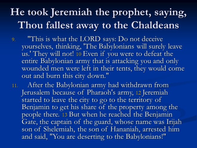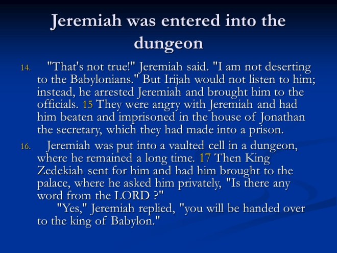 Jeremiah 38. Jeremiah was in the dungeon and near death so they pulled him up to question him some more. Zedekiah feared for his life, and Jeremiah’s advice was: Give in to Babylon and you will live.