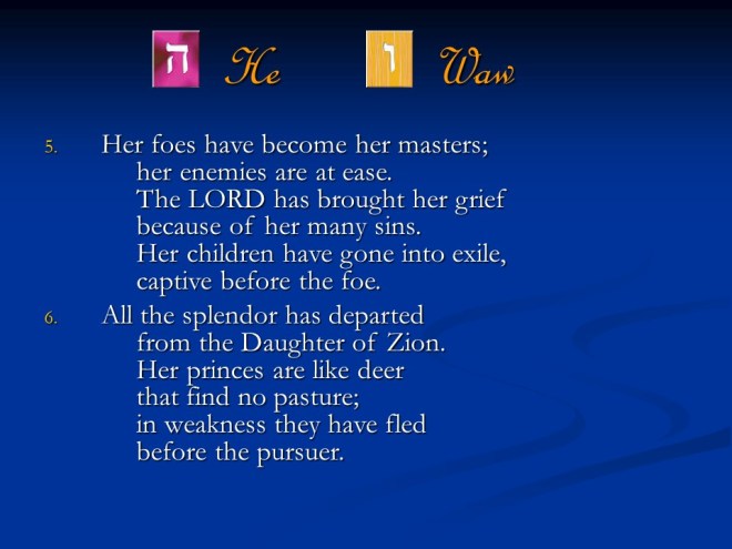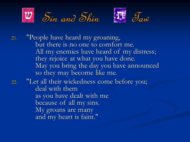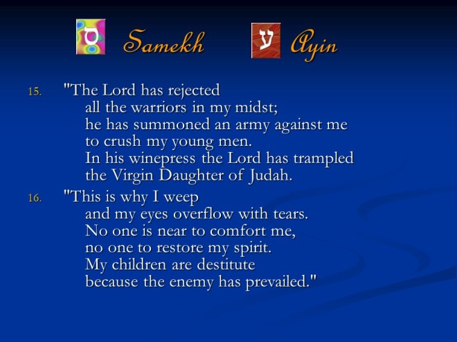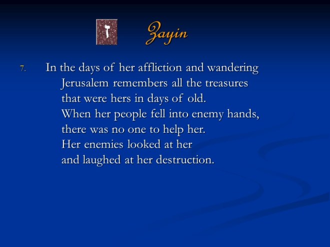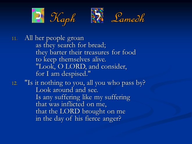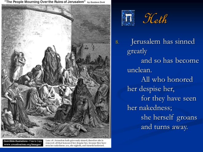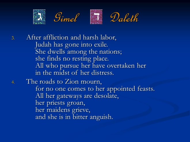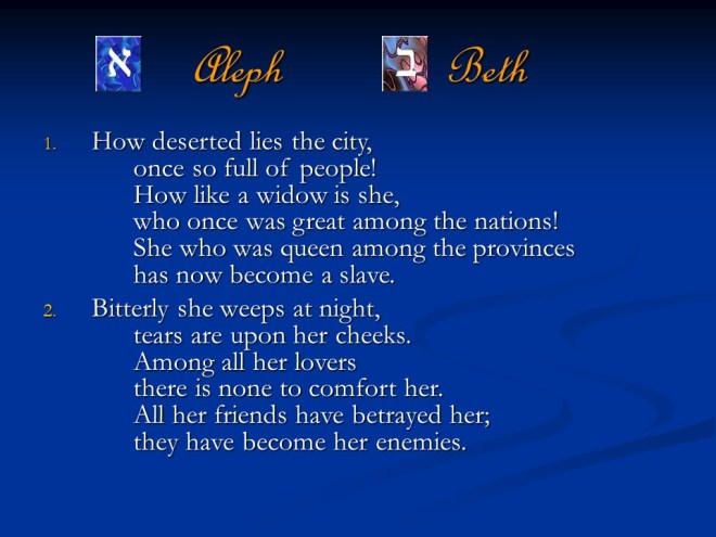 Lamentations 1. It was written as dirge poetry at the time when Jerusalem was afflicted and captured. It is a true acrostic, which means the twenty-two letters of the Hebrew alphabet are used in succession to begin the lines and sections of those songs.