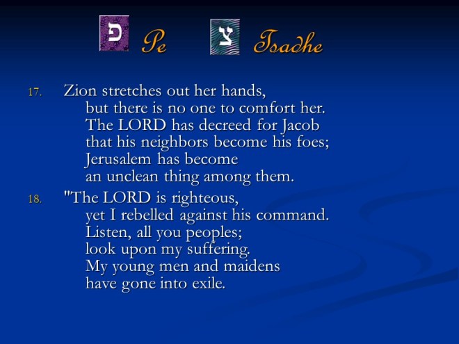 Lamentations 2. It too is dirge poetry written in an acrostic form emphasizing God’s anger over Jerusalem.