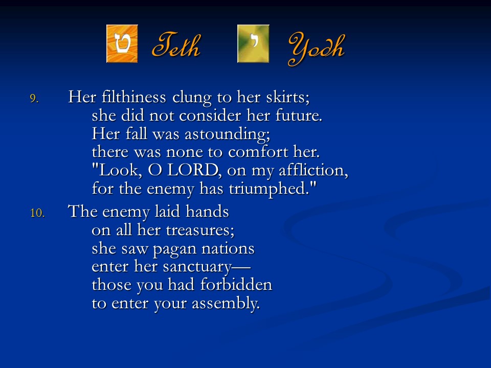 Lamentations 1. It was written as dirge poetry at the time when Jerusalem was afflicted and captured. It is a true acrostic, which means the twenty-two letters of the Hebrew alphabet are used in succession to begin the lines and sections of those songs.