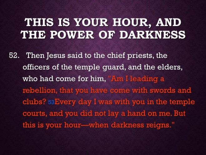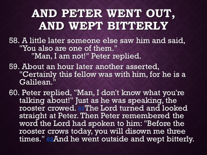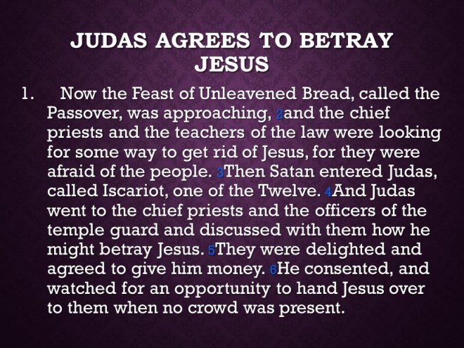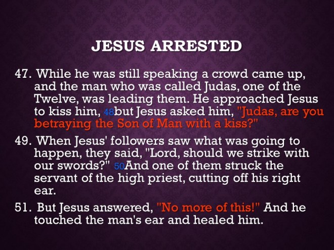 Mark 14:32-72. After Judas Iscariot left the eleven remaining disciples, they and Jesus went to the Mount of Olives where there is a garden called Gethsemane. While they were there Jesus Prayed intensely. Judas Iscariot reappeared and betrayed Jesus with a kiss. The accompanying soldiers arrested Jesus, and he was brought before the Sanhedrin. Peter was waiting outside and denied Jesus three times, after which the cock crowed twice.