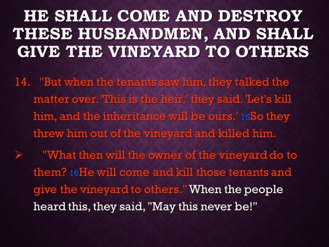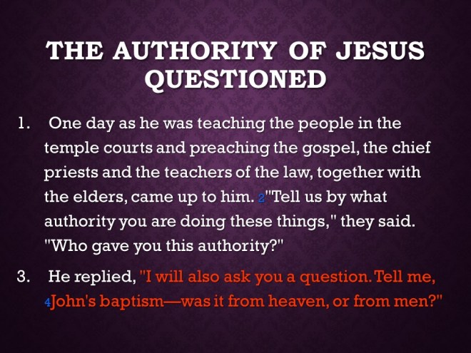 Mark 11 starts what is called the Holy Week with the Triumphal Entry into Jerusalem. Jesus entered, riding on an unbroken foal of a donkey. This was the sign. The next day Jesus cursed a fig tree (symbol of Israel) and cleared the Temple of the money changers (You don’t want to give too much, you know). Following morning the fig tree was withered, and all marveled. Finally, Jesus authority was questioned by the religious authorities.