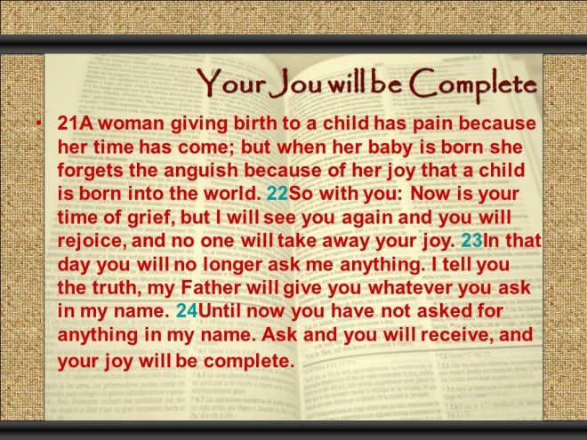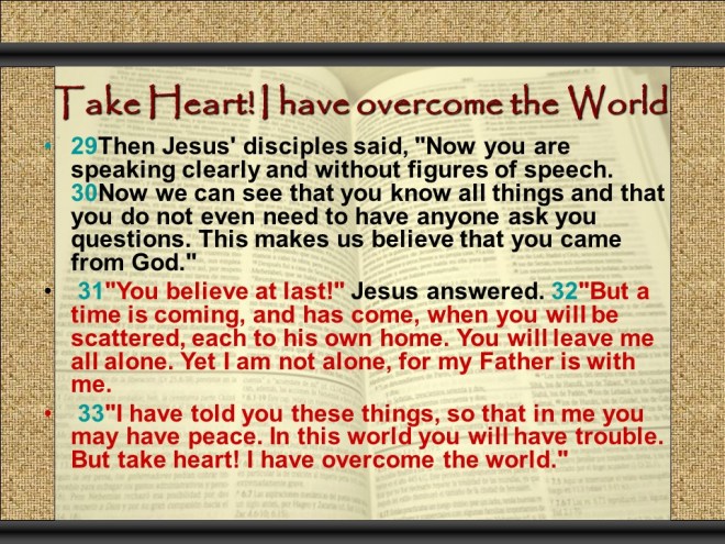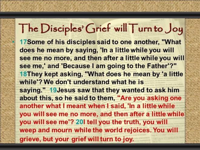 John 16:17-33. Jesus continued his instructions to his disciples. They did not understand why it is good he leaves and sends the Holy Spirit. Jesus promised that their grief would turn to joy and ended with this encouragement: “In this world you will have trouble. But take heart! I have overcome the world.”