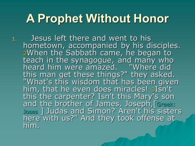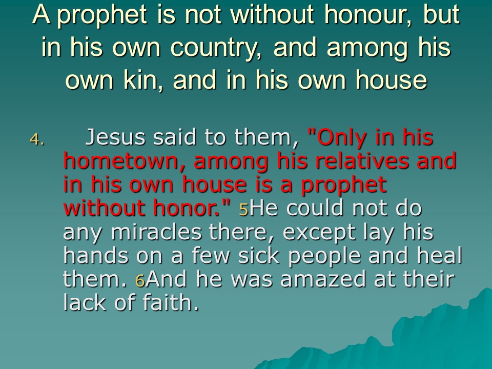 Mark 6:1-13, In Mark 6  Jesus proclaimed ”A Prophet is not without honor, but in his own hometown, and among his own kin.” Jesus sent out the Twelve disciples, and they were amazed they could heal too.