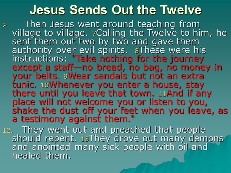 Mark 6:1-13, In Mark 6  Jesus proclaimed ”A Prophet is not without honor, but in his own hometown, and among his own kin.” Jesus sent out the Twelve, and they were amazed they could heal too.