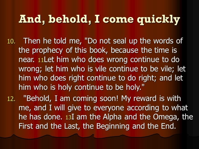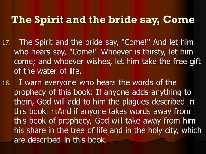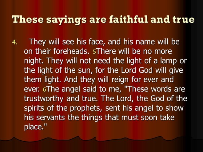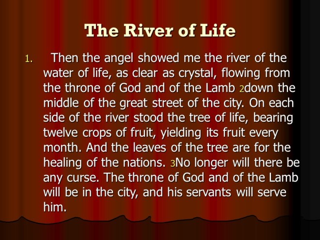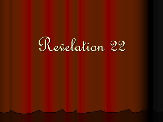 Revelation 22 begins with the Angel showing the Apostle John the River of Life, the time is near, Jesus is coming soon and He testifies to the Churches, don’t add to or take away from God’s word. Jesus is coming Quickly, Amen!