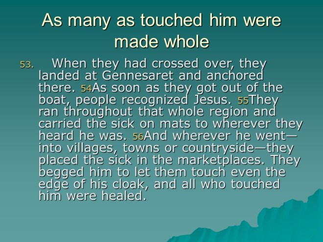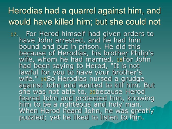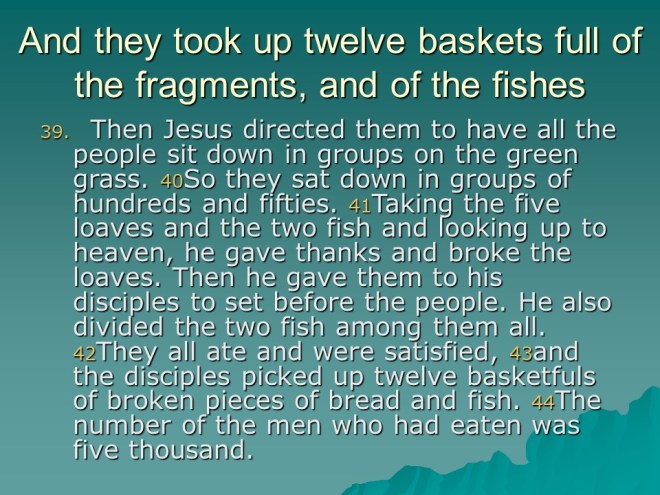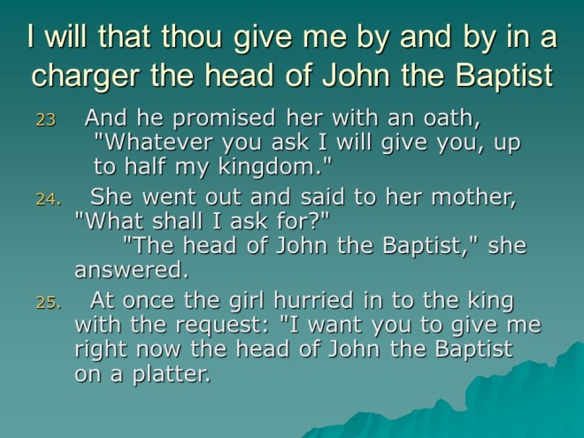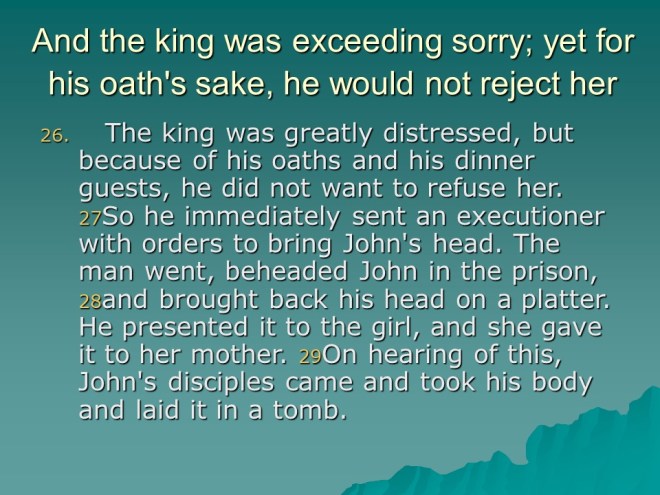 Matthew 14 tells about John the Baptist being beheaded. It is interesting that most people know the name of the daughter of Herodias, but it is not in the Bible. There is another Salome in the Bible, but she was a follower of Jesus. After learning of the beheading of John the Baptist Jesus tried to withdraw from the people by boat to a solitary place, but there he found a large crowd, so he decided to feed the gathering of 5000 plus women and children with five loaves of bread and two small fishes. After all were satisfied the disciples picked up twelve baskets of leftovers. Jesus dismissed the crowd, made the disciples go in a boat to travel to the other side of Lake Genesareth, and then after Jesus had prayed alone he joined them by walking on the water. A very interesting read.