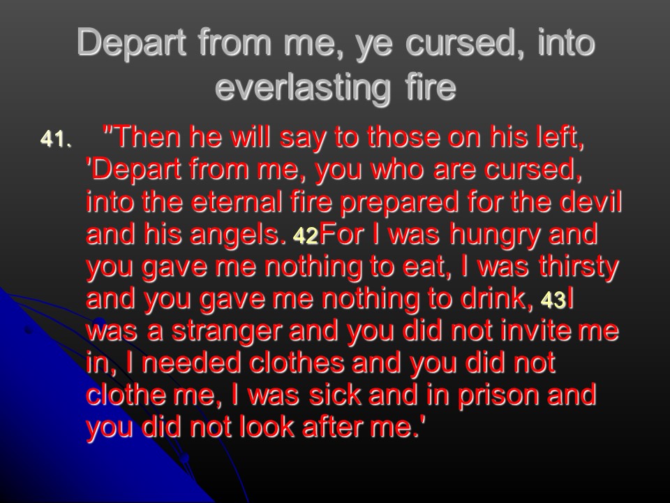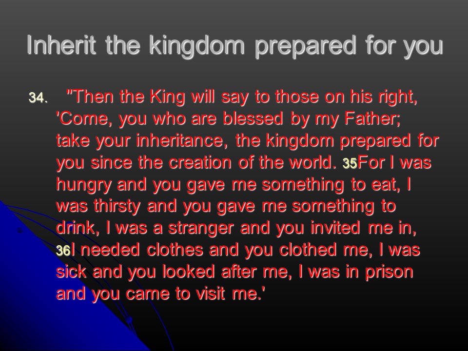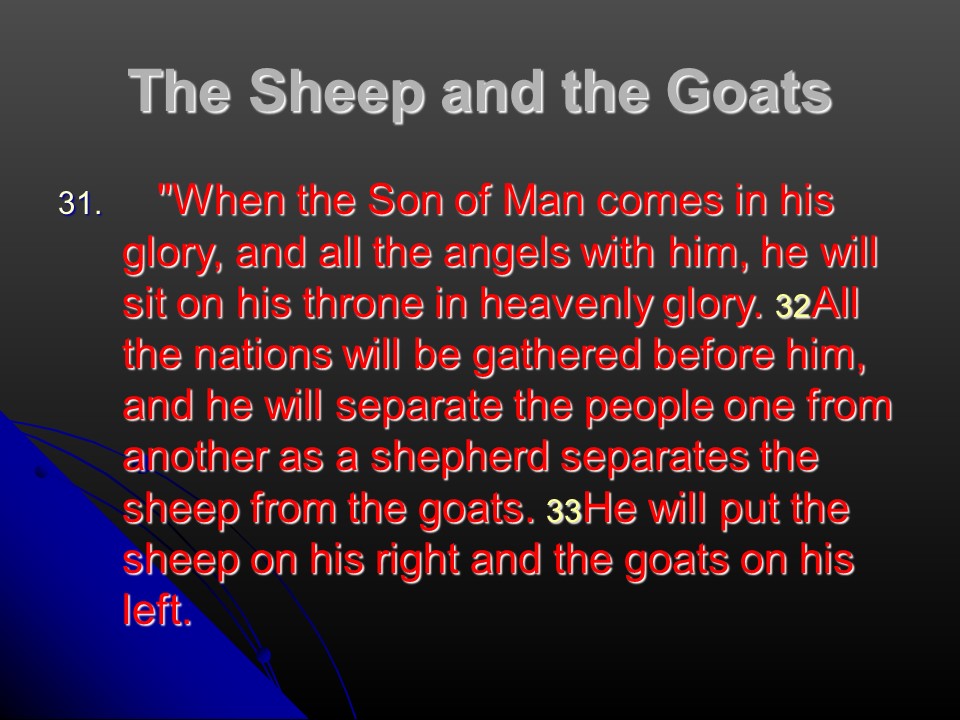 Matthew 25: 31-46. Jesus will return to judge the nations, to illustrate how he told the parable of the sheep and the goats, and the sheep were defined as those who do God’s will “You did it for me.”