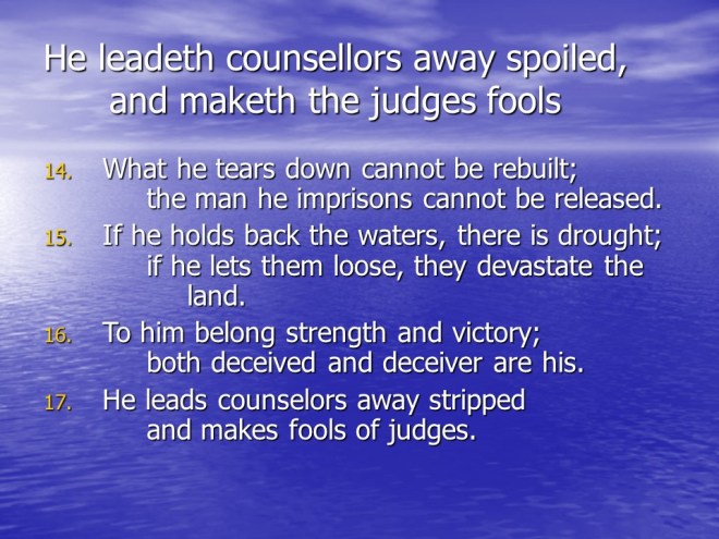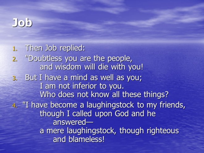 Job 13. Job continued answering his three friends, and added a despondent prayer that contains this gem: “Though he slay me, yet will I trust in him.”