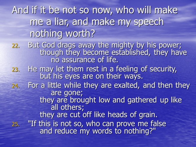 Job 26. Job replied and spoke of man’s frailty and God’s majesty.