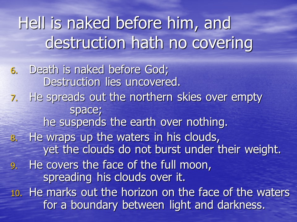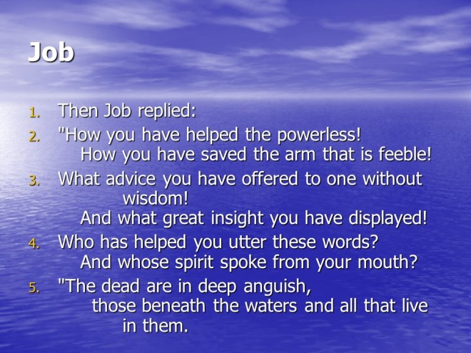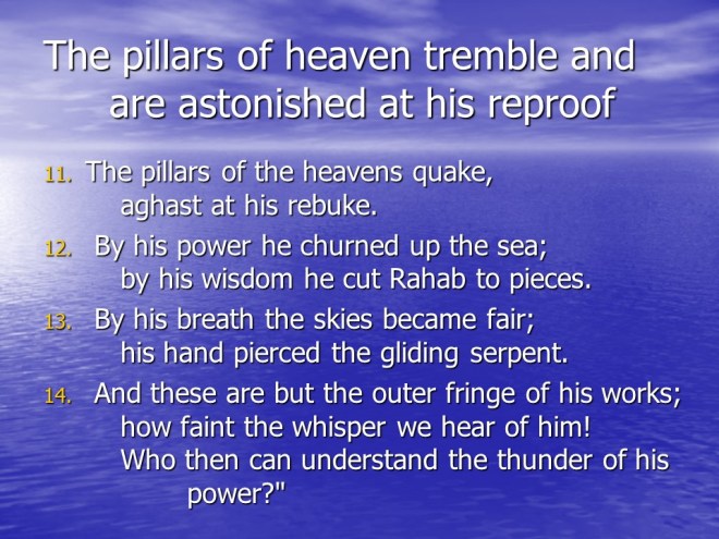 Job 26. Job replied and spoke of man’s frailty and God’s majesty.
