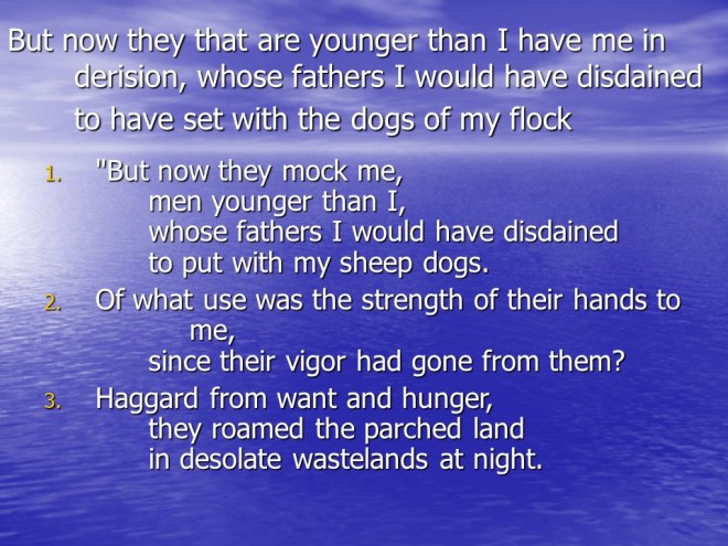 Job 30: “But now they that are younger than I have me in derision, whose fathers I would have disdained to have set with the dogs of my flock.” Things were not going well for Job.