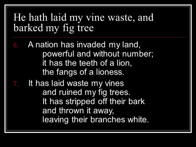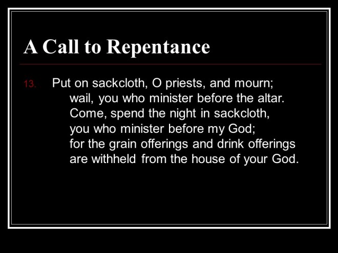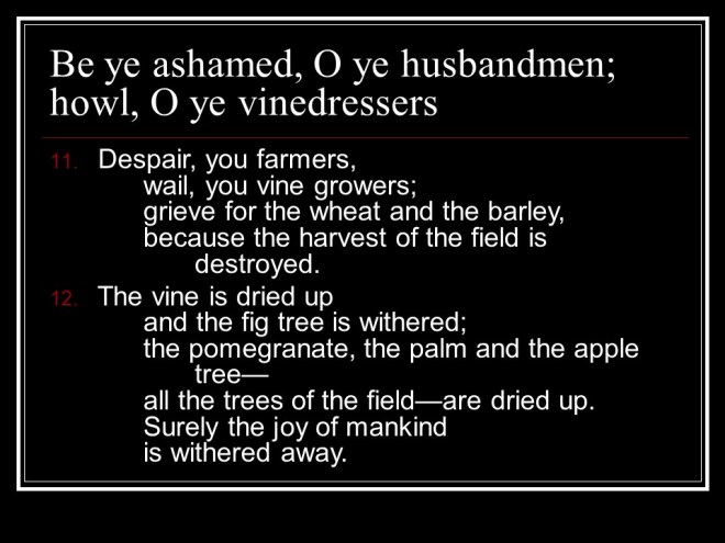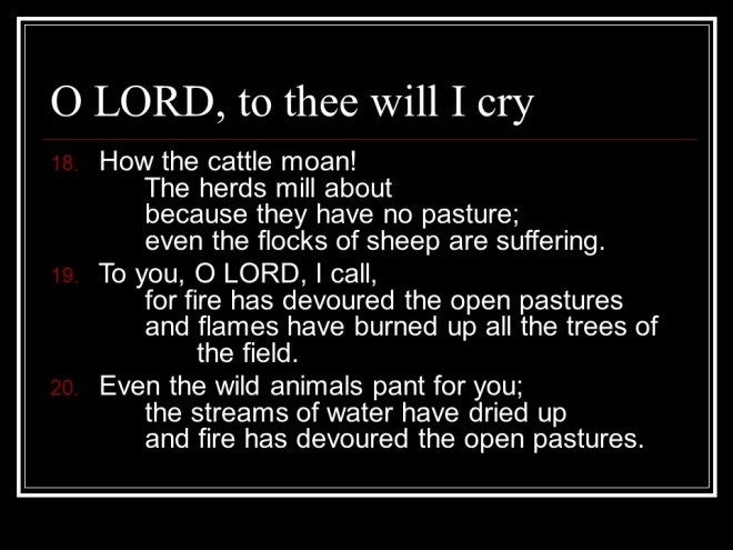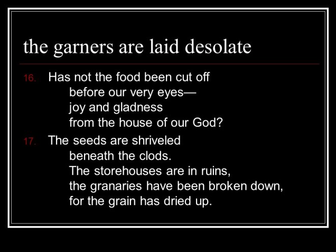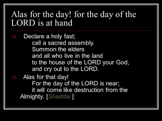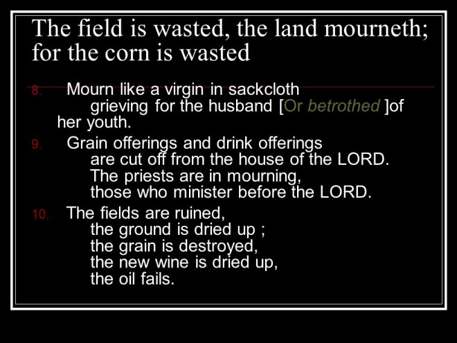 Joel 1. The Word of the LORD told Joel of the great locust attack, the drought and the land laid waste. Lament for the land, for the day of the LORD is near.
