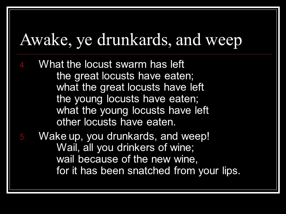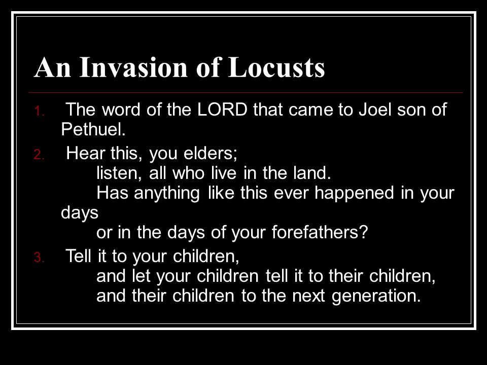Joel 1. The Word of the LORD told Joel of the great locust attack, the drought and the land laid waste. Lament for the land, for the day of the LORD is near.