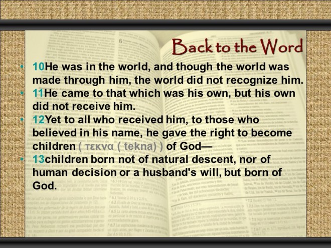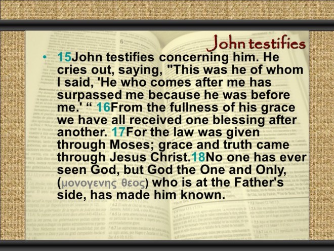 Verse 16 is very interesting. The second half reads in Greek “και χαριν αντι χαριτος”  which literally translates “and grace instead of grace” King James translation reads “and grace for grace, which lost a lot in the translation. The first “grace” is in the accusative, the second in the genitive. A better translation would be ” and proactive, dynamic grace instead of grace more like mercy. The Old Testament concept of grace is more like mercy, the New Testament concept of grace is best expressed in Romans 5:8 “But God demonstrates his own love for us in this: While we were still sinners, Christ died for us.”