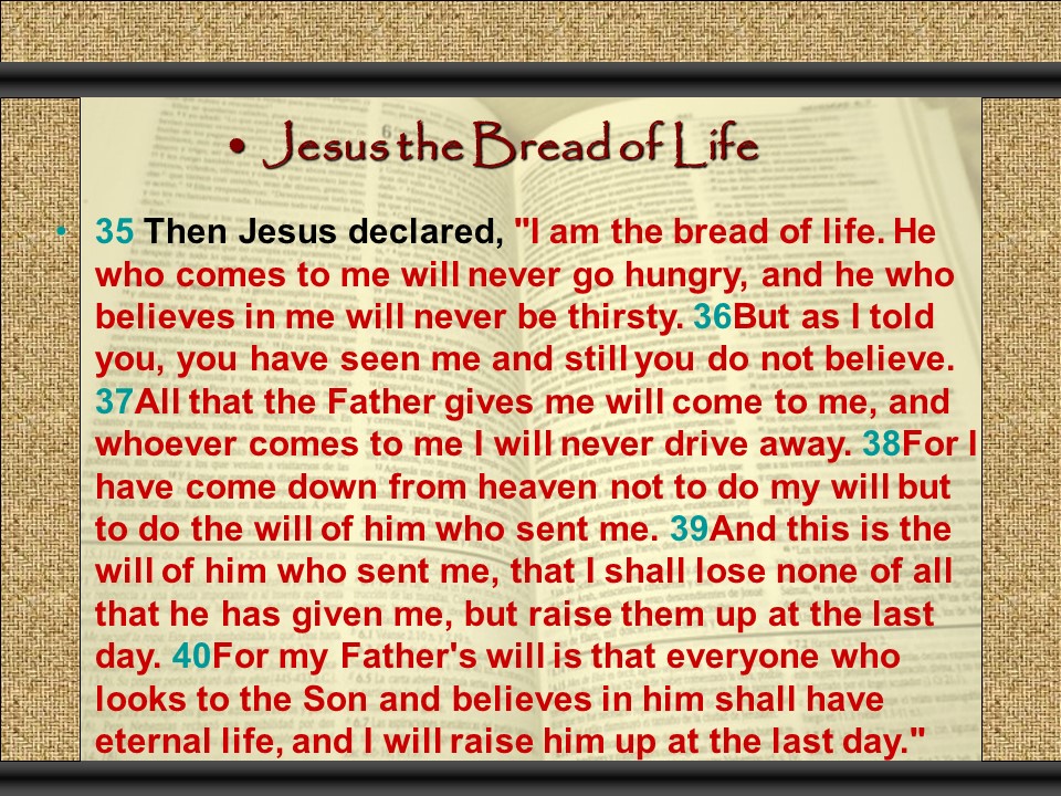 John 6:25-71. Jesus had fed the five thousand and been seen walking on water. In spite of these miracles the Jews demanded a sign. Jesus responded in kind by saying he is the bread of life, and if people want to have eternal life they must come to him and eat of his flesh and drink of his blood. When hearing this, many abandoned Jesus, but Peter said: To whom shall we go? You have the words of eternal life.
