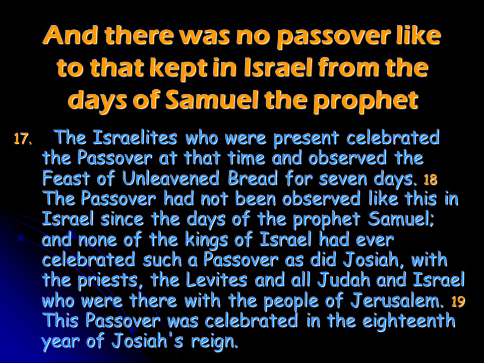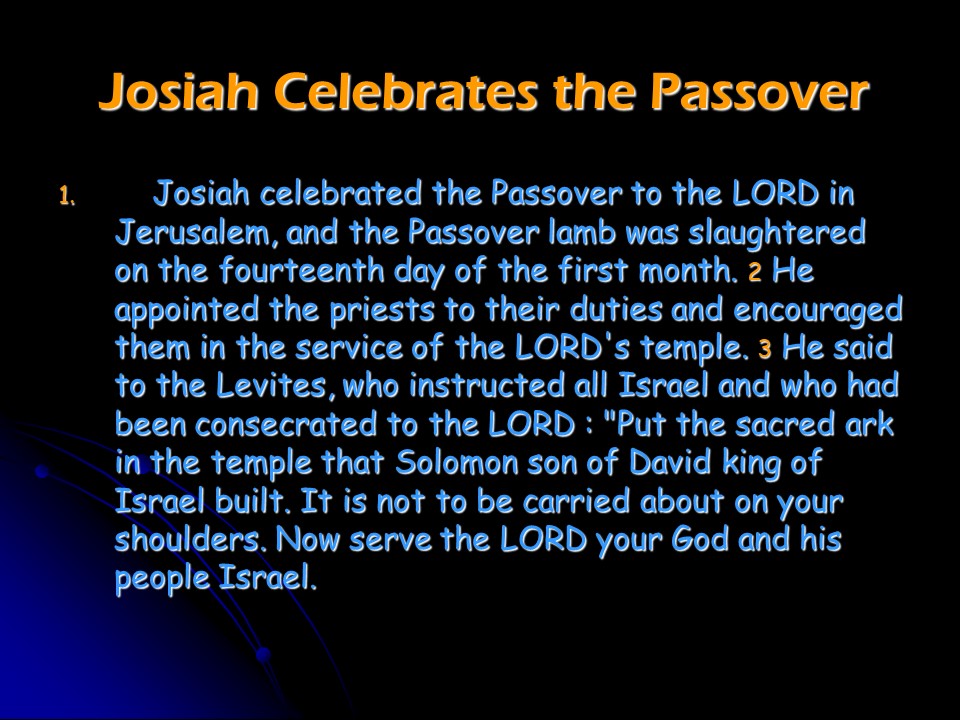 2 Chronicles 35. Josiah celebrated Passover lavishly but after that he foolishly engaged king Neco of Egypt, who intended to fight somebody else. The result was that Josiah died in battle. One of the mourners was the Prophet Jeremiah that wrote the book of Lamentations as a result.
