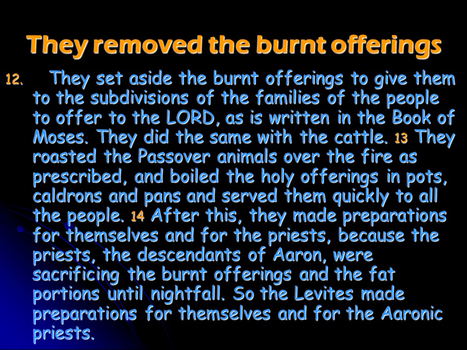2 Chronicles 34. King Josiah tore down the altars to the idols, but not before he had their priests killed and burned on them. Then he took up offerings to restore the temple. Hilkiah the priest found the Book of the Law. Josiah then restored the temple and the temple worship and the people followed as long as Josiah lived.