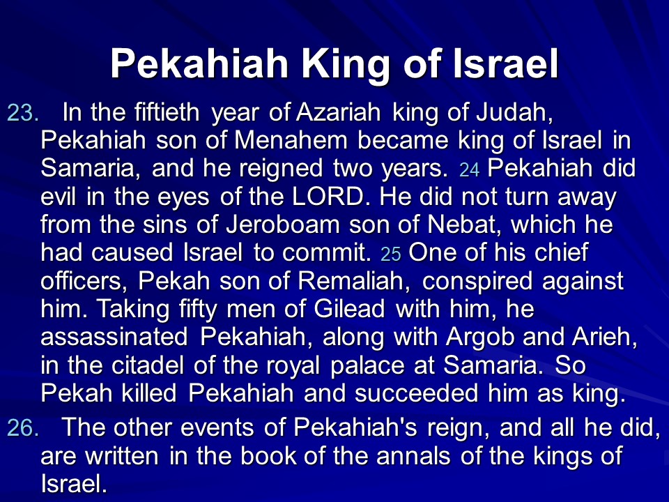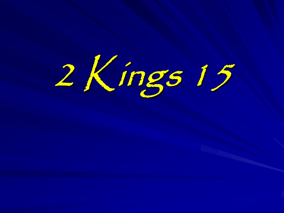2 Kings 15. The parade of Kings of Israel and Judah continues. Azariah reigned in Judah, Zachariah reigned in Israel, Shallum reigned in Israel, Menahem reigned in Israel, Pekahiah reigned in Israel, Pekah reigned in Israel, Jotham reigned in Judah, all recorded in chronological order.