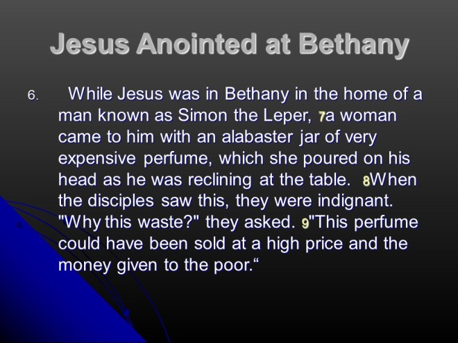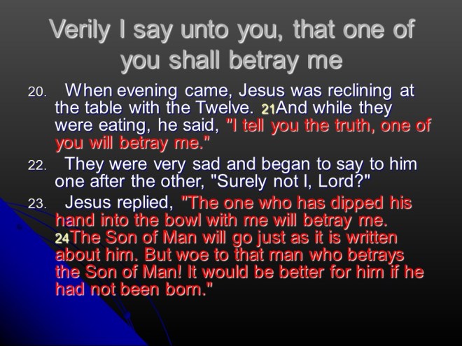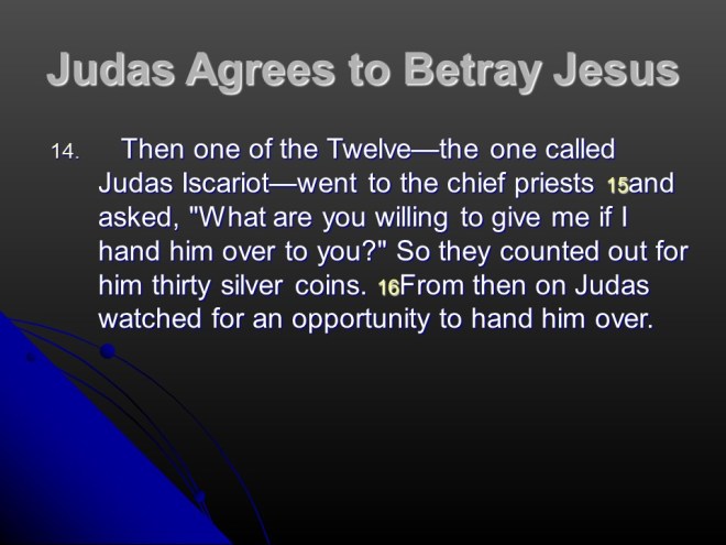 Matthew 26:1-30 is very important. It begins with the plot against Jesus, continuing with his anointing at Bethany, then Judas agreeing to betray Jesus for thirty pieces of silver. The Lord’s supper was initiated, and Jesus predicted who was going to betray him.