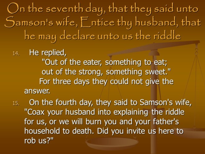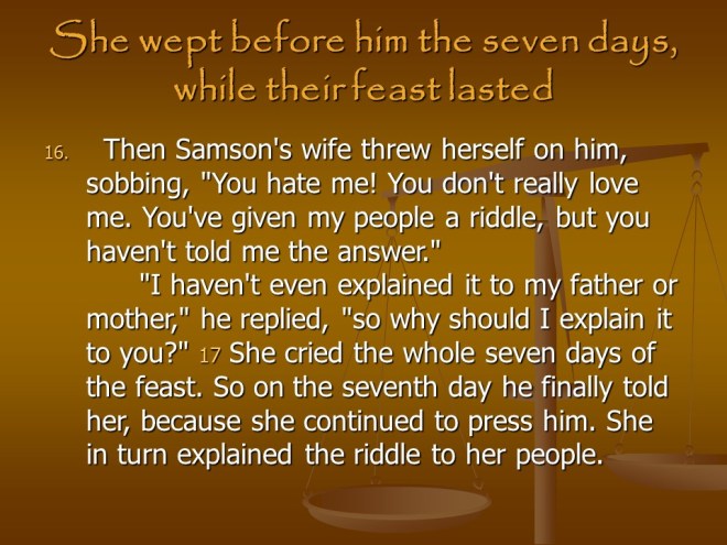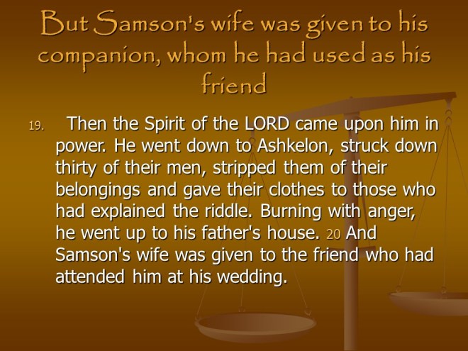 Judges 14. Samson started out great, but then he took a Philistine as his Wife.