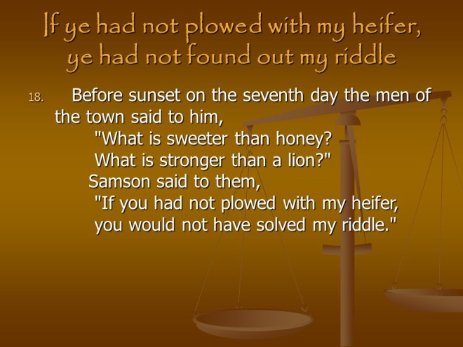 Judges 15. Samson defeated the Philistines with the jawbone of an ass.