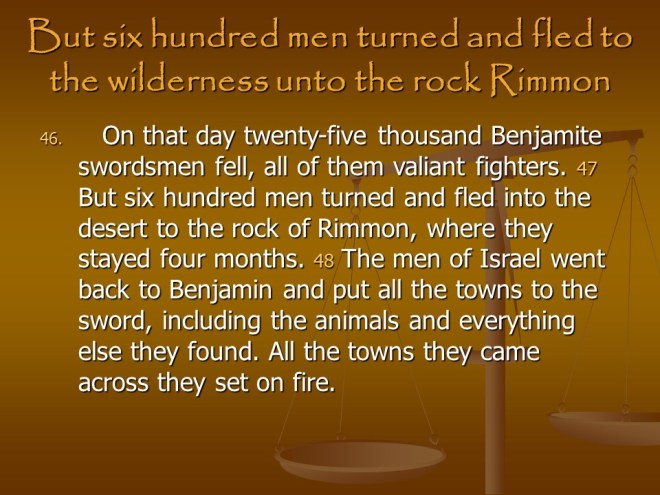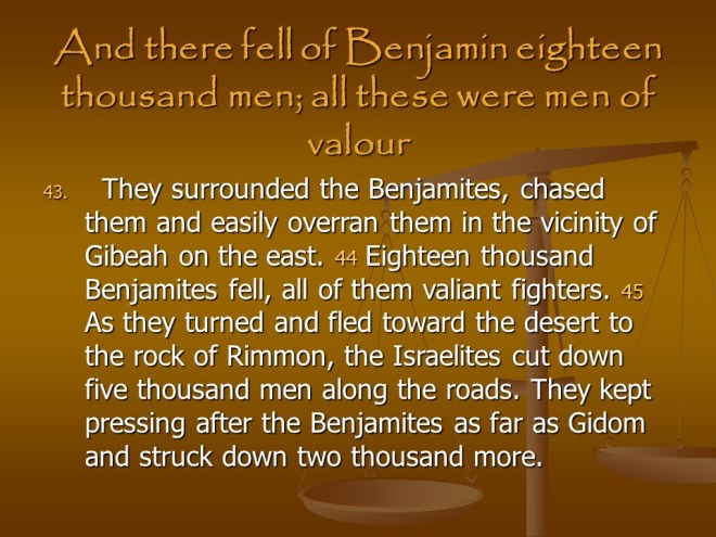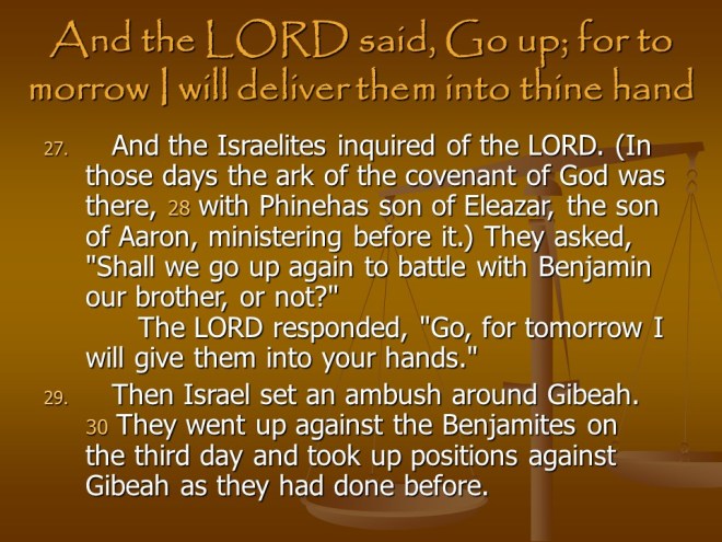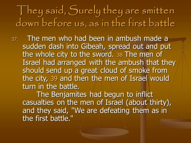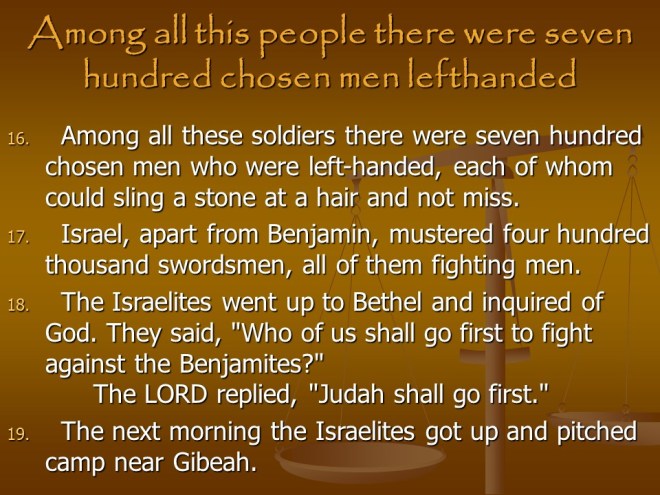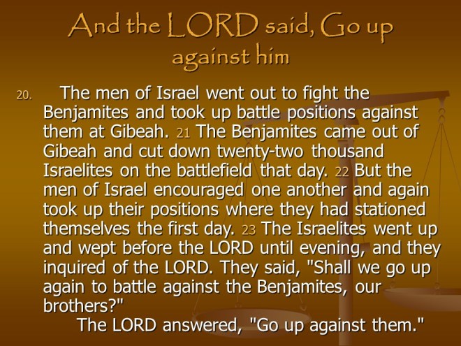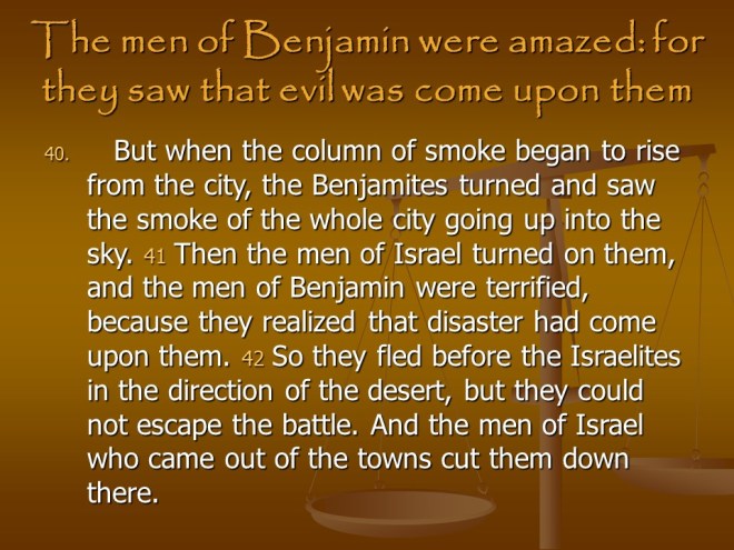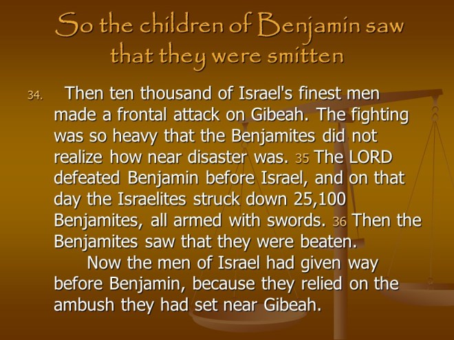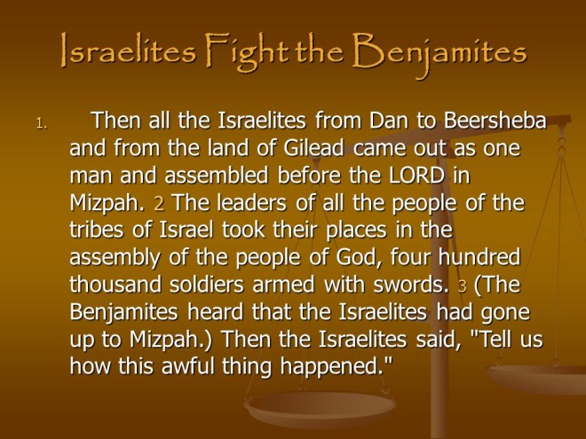 Judges 20 describes Israel’s War with the Benjamites. Another horrendous chapter.
